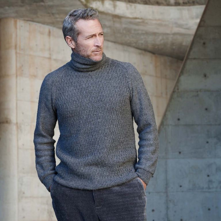 Alpaquina high-neck men’s sweater pattern This men’s sweater knit with Alpaquina is a must-have in any wardrobe. The high neck and the “broken slip stitch” of the body make it really comfortable to wear, while the classic and timeless color make it ideal for all kinds of occasions.