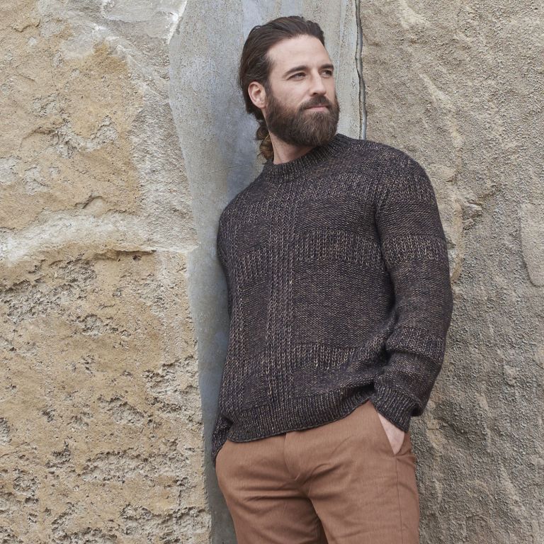 Man's jumper knitted on straight needles in reverse stockinette stitch with an eye catching design of vertical and horizontal stripes in mock fisherman's rib.