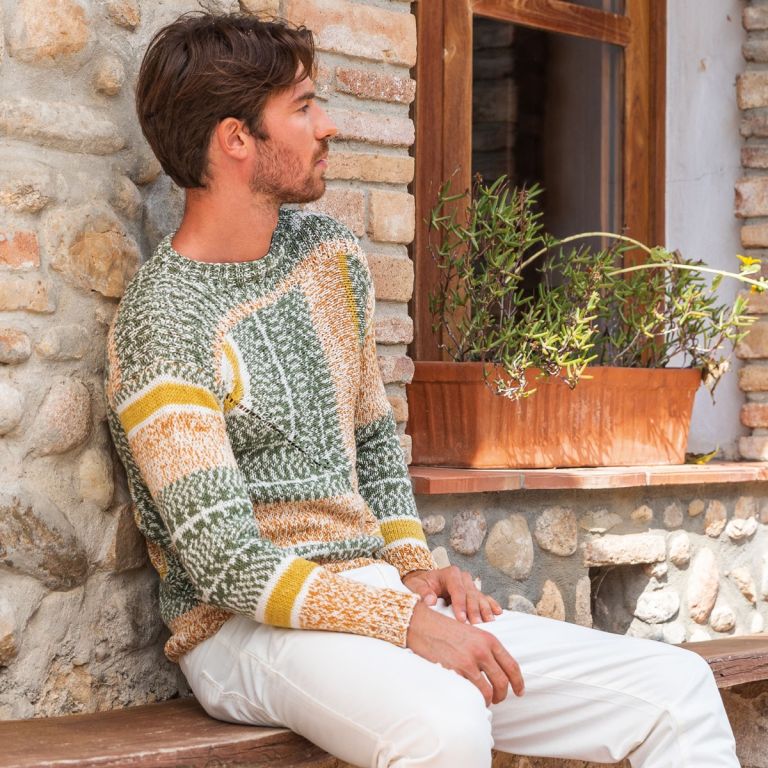 Learn the mitered square technique and knit this delightful men's sweater. Discover how the Jacquard design comes out by knitting a simple stitch using Mediterranea yarn. Perfect for intermediate knitters.