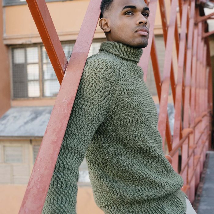 Basic Merino Tweed turnover collar mens sweater pattern This turnover collar mens sweater knit with Merino Tweed yarn is perfect to give your everyday looks a handmade vibe. The alternating rib stitch adds comfort, and the raglan sleeves give it a modern vibe.