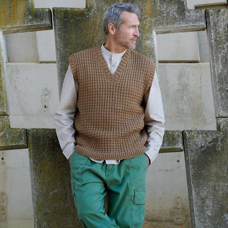 Cashmere 10 V-neck men’s vest knitting pattern This Cashmere 10 men’s vest is a modern piece to add to your wardrobe. Knit in fantasy stitch, it’s perfect to wear over a shirt or thin sweater.