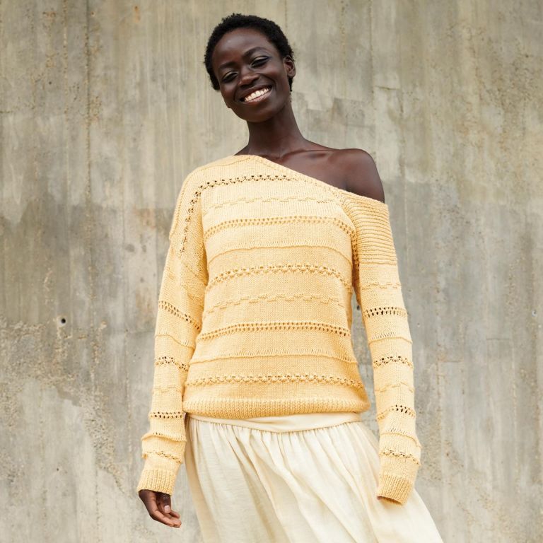 This asymmetric neckline sweater pattern from the All Seasons 6 magazine is perfect for those seeking a trendy and original design. Knit with Eunoia by Concept by Katia in a horizontal fantasy stitch, its uneven V-neck that reveals the shoulder makes it ideal for pairing with dresses or jeans. Add a modern, unique piece to your handmade wardrobe!