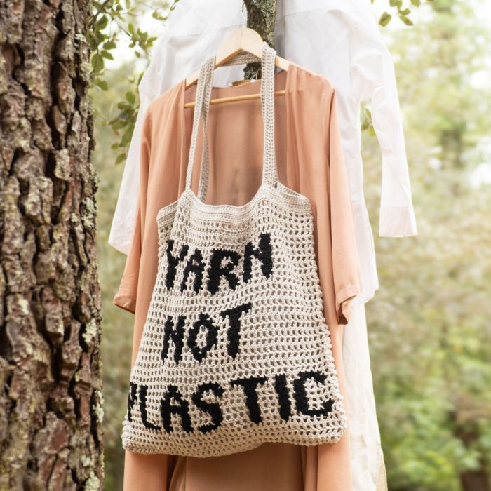 A large crochet tote bag with an ecological message crocheted using Fair Cotton. Fair Cotton is an organic cotton, respectful of the environment and free of any toxic substances.