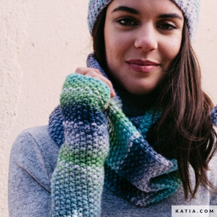 Knit a complete Winter set using moss stitch and only a few balls of multicolour yarn. Create a multicolour pom pom hat, easy to knit wrist warmers and cosy neck cowl, all knitted using Katia Azteca yarn.
