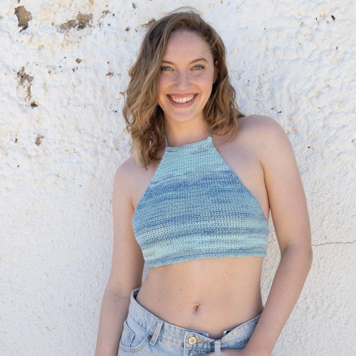 Discover how easy it is to crochet crop top. With just one skein of Katia Marea, a yarn made from recycled fibers with a delicate tonal print, create a lightweight and versatile top that ties at the neck and back. Perfect for the beach, paired with a long skirt or denim shorts. A stylish and cool garment that’s a must-have for your holiday wardrobe.