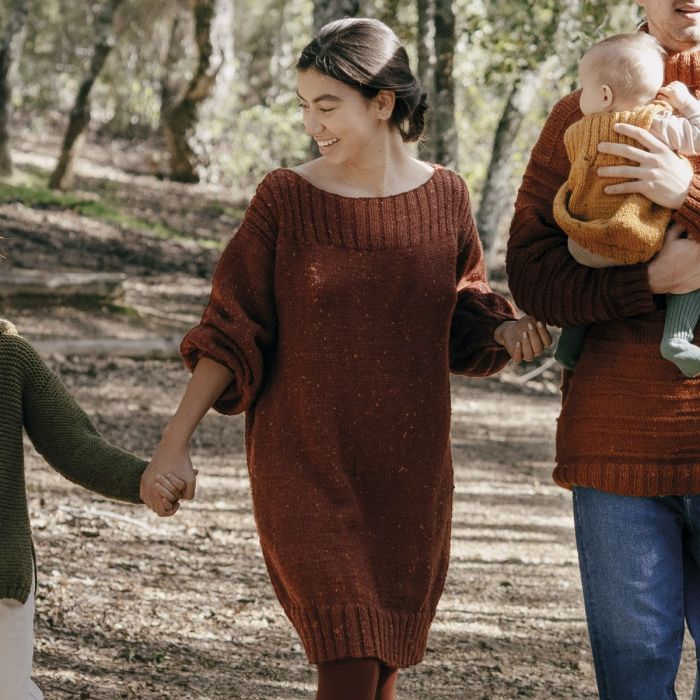 Woman's comfortable dress knitted in Merino Tweed. The modern puffed sleeves and fashionable rust color are particularly eye catching. Dare to cast on the stitches for your next favorite garment!