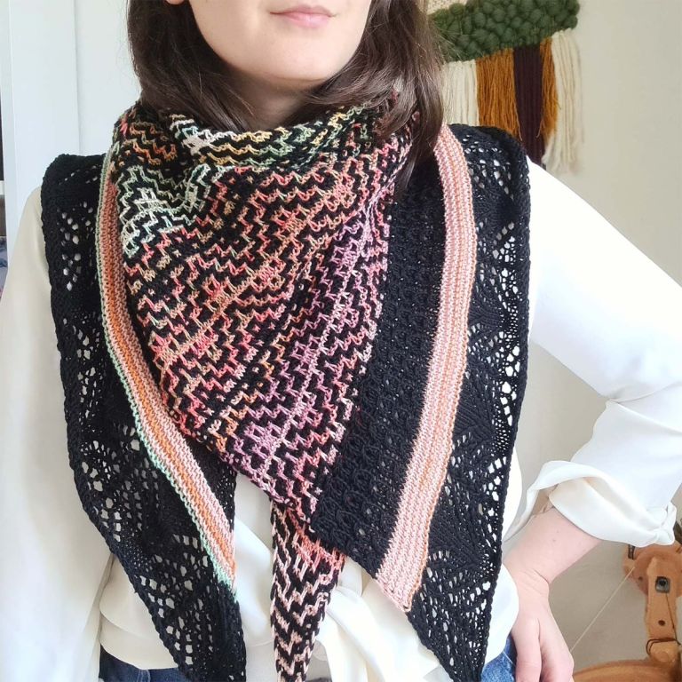 Knit the stunning Elspeth Shawl with Katia Fair Cotton Diverso and Fair Cotton. Designed by Audrey Borrego @yarnflakes, this asymmetrical shawl combines colorful mosaics with a delicate lace border. Perfect for relaxing while creating a unique piece. Try it with Katia Fair Cotton Infinity or Fair Cotton Granny for surprising results.