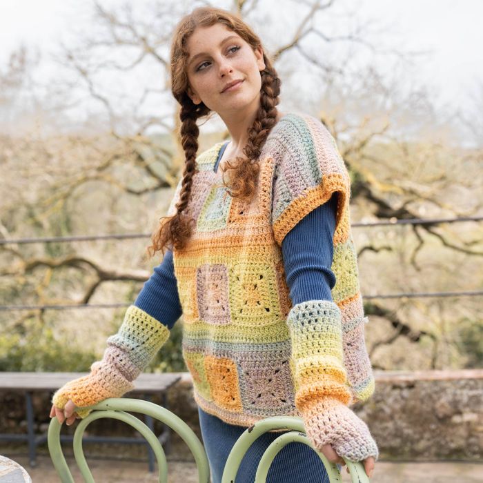 Funny Azteca oversized vest and mittens crochet kit This oversized granny square vest and crochet mittens made with colorful Katia Funny Azteca yarn are the most youthful set of the season! Pair it with your favorite sweater for a warm, modern, and trendy look.