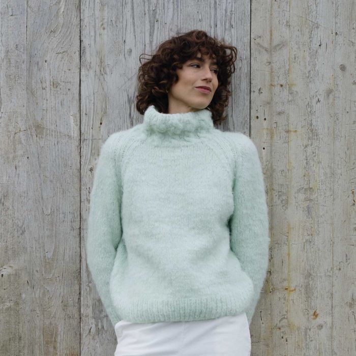 Choose warmth and style with this high-neck cabled sweater knit in the round with WOW Fluffy. Discover an essential piece for your handmade winter wardrobe to wear on every occasion, whether with your favorite jeans or a short skirt with tights. Enjoy creating cozy garments that feel just right.