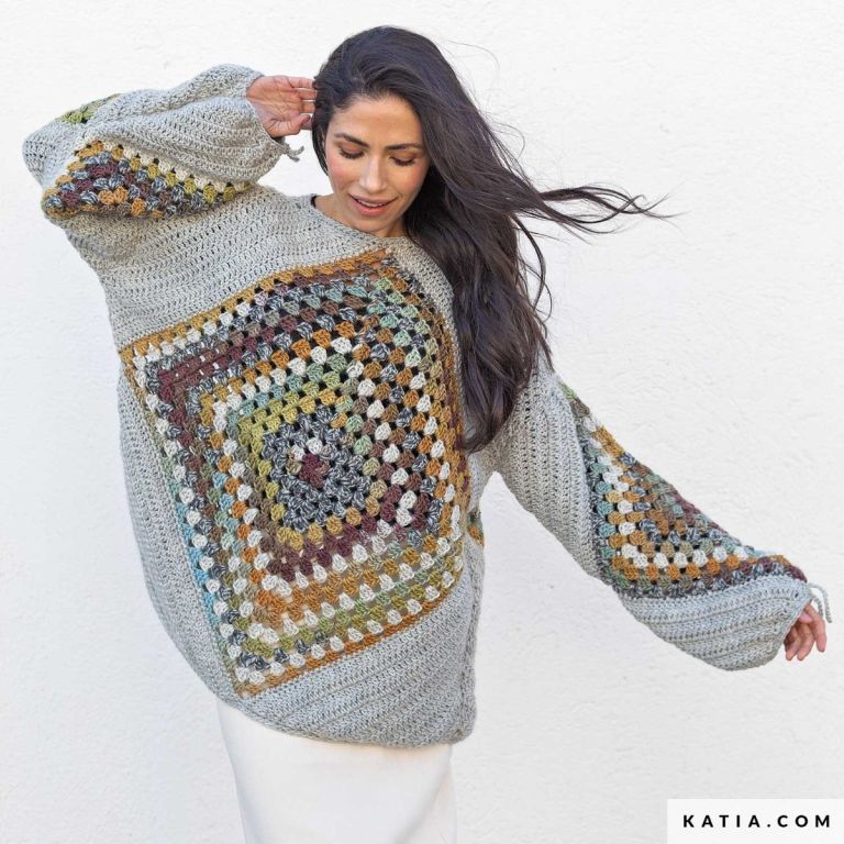 Download our free pattern for an oversized crochet maxi pullover using Kirei and Kirei Color! This fun sweater is perfect to pair with basic pants, and you can create your own color combination. The puffed sleeves with cords at the cuffs allow you to adjust them to your liking. If you’re on Team Granny Square, this easy and fun crochet sweater is for you!