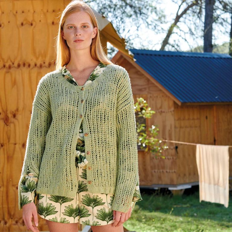 Dama women’s lace cardigan pattern This round neck women’s lace cardigan is perfect to add a modern vibe to your looks. Dama is a natural fiber yarn that provides a unique texture to this cardigan, which makes it perfect as a retro wardrobe staple. We suggest knitting it in on-trend summer colors, and wearing it with a dress or skirt.