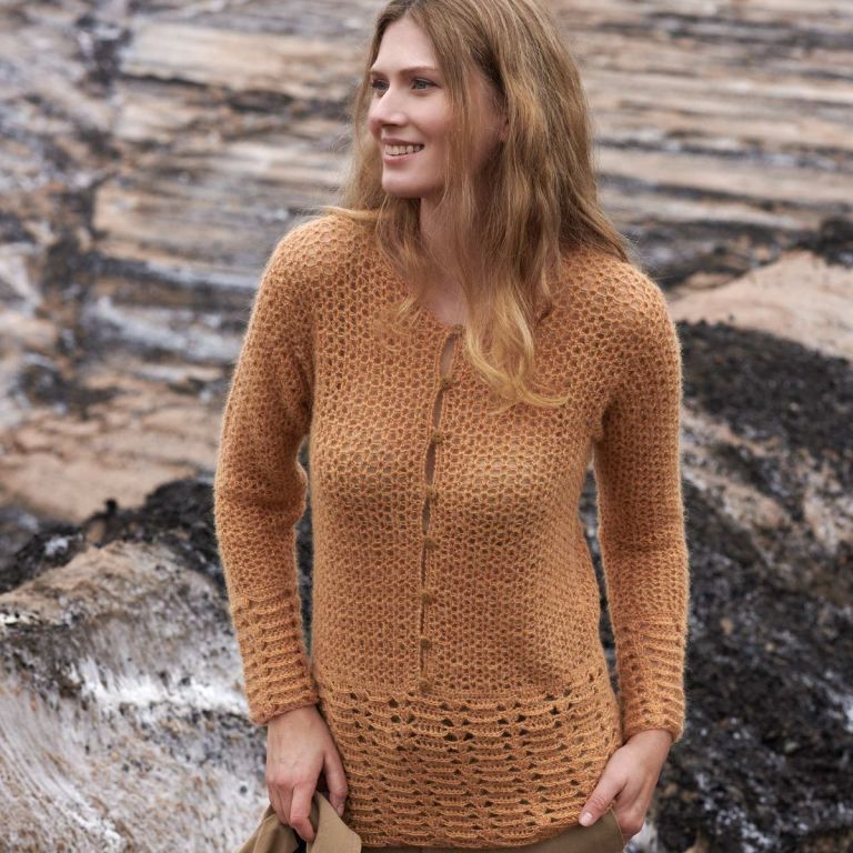 Add a vintage vibe to your wardrobe with this lace sweater pattern, crocheted with delicate Alpaca Lace by Concept by Katia. This retro design combines two fantasy stitches, a round neckline, and decorative buttons. It stands out for its elegance and originality. Find this perfect pattern for any occasion in the Concept 16 magazine. Get your crochet hook ready to make this unique sweater!