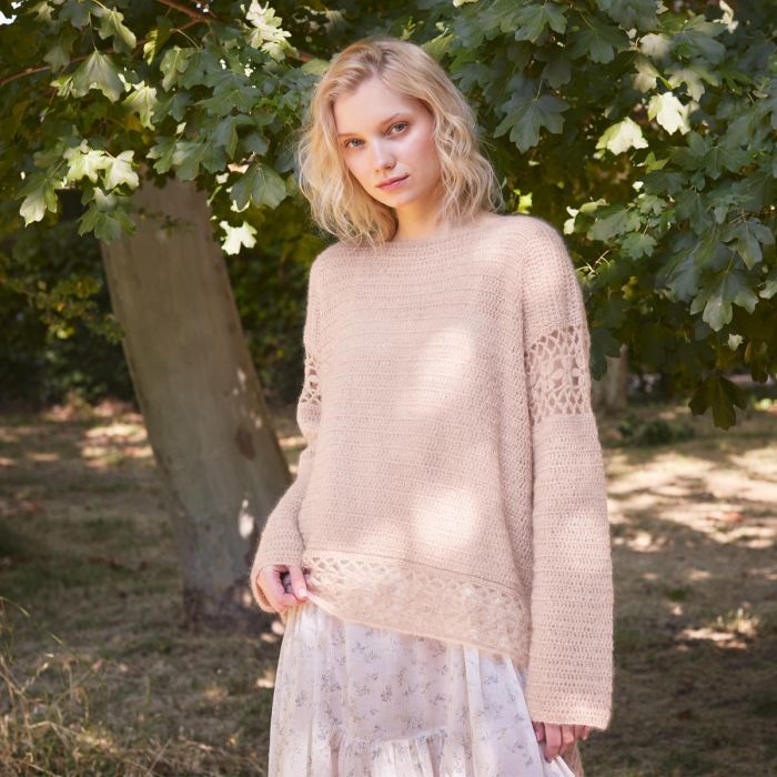 A delicate crochet sweater with lace details on the sleeves and hem that stand out in this simple piece with a round neckline. The lightness of Concept Silky Mohair caresses the skin and enhances the texture with its soft halo. Available in the Silky Mohair magazine and as a PDF at katia.com/us.