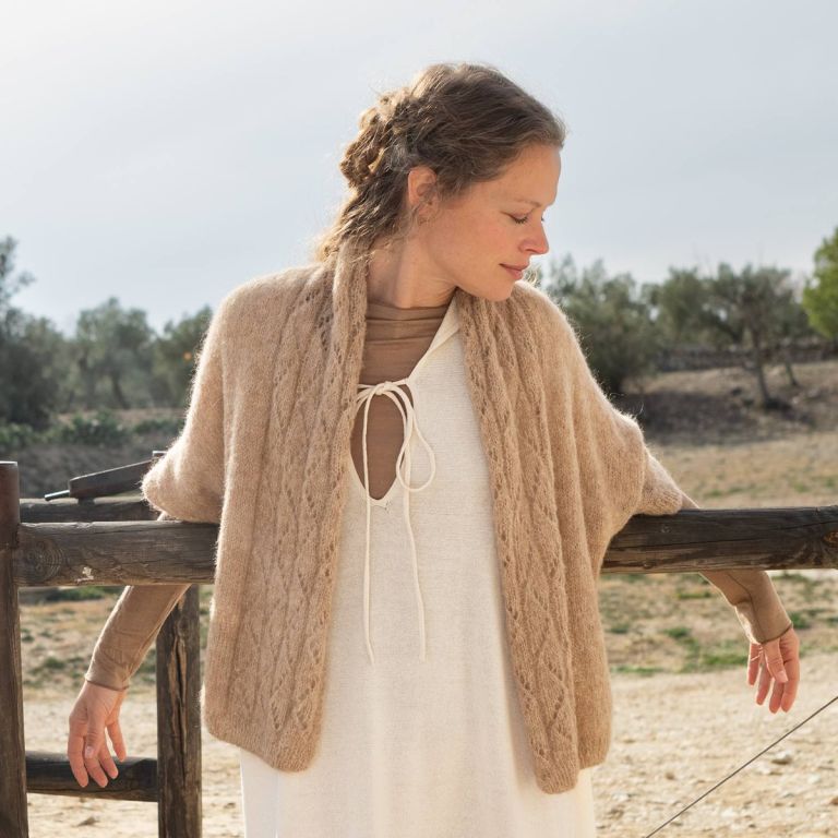Discover this cropped cardigan pattern with Japanese sleeves, knitted with straight needles in a delicate zig-zag lace stitch. The exquisite, soft, and brushed Silk Alpaca Natural Colors yarn by Katia makes this piece perfect for pairing with dresses or jeans, offering great lightness and elegance. Knit this sophisticated and comfortable piece for your next project!