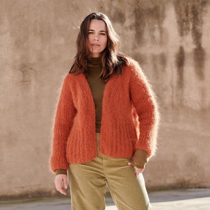 Reiki straight cardigan knitting kit Knit your straight-lined cardigan with Reiki! This versatile garment features large 2x2 ribbing and straight 1x1 rib sleeves. The luxurious yarn, made of superfine alpaca in multiple colors, combines perfectly for a unique look. Increase your handmade wardrobe with this Reiki cardigan pattern!