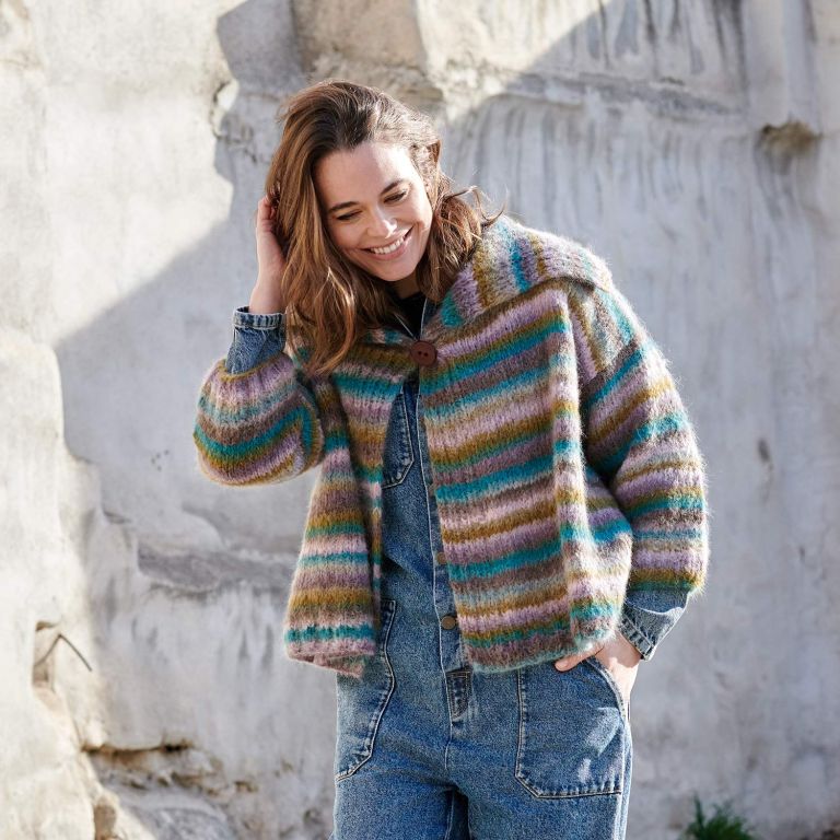 Reiki French sleeve cardigan knitting pattern Look stunning in this French-sleeved knit cardigan with a large lapel collar. Made with Reiki, this fluffy knitted garment stands out thanks to its multicolored striped pattern, using our exclusive superfine alpaca yarn. Add a bold look to your outfits with this cardigan, designed to offer you optimum comfort during your everyday life. Dare to look unique with Reiki!
