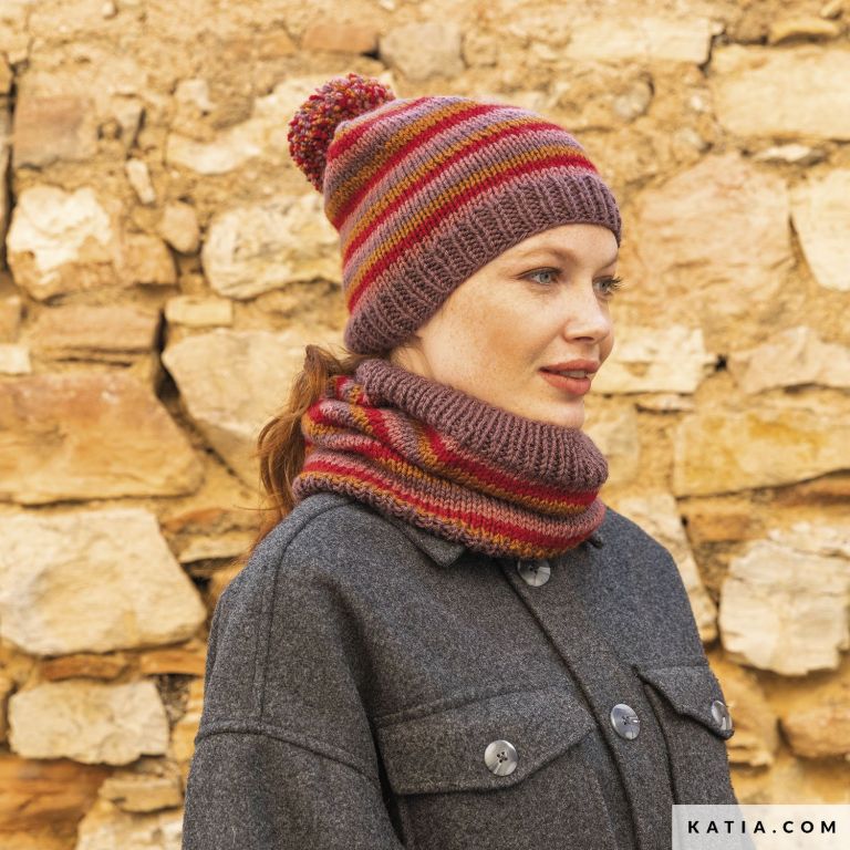 Add colour to your Winter looks with this striped neck warmer and hat set. Create your own colour combination among the wide range of Merino Aran colours. Download the free pattern and knit matching neck warmer and hats with pompoms for you and the entire family.