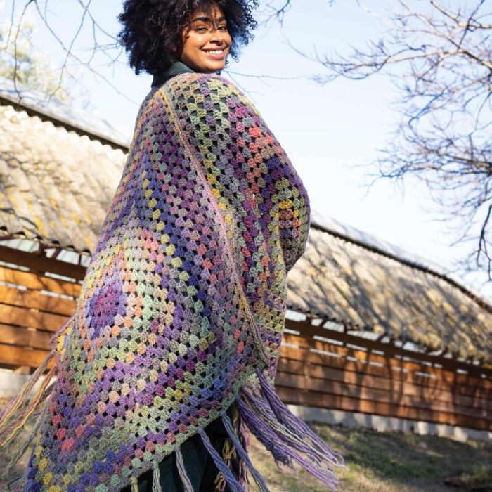 Wrap your gray winter days in this spectacular oversized crochet shawl. Composed of three large granny squares and a long fringe, it’s easy to crochet and provides an impressive result thanks to Katia Azteca’s colors. Add a touch of color to your wardrobe by crocheting this magnificent shawl!