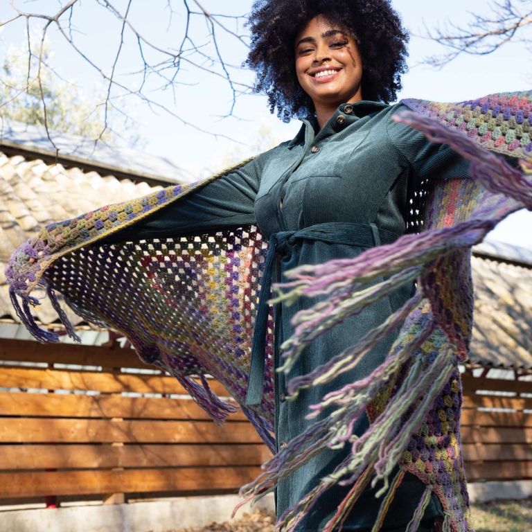 Wrap your gray winter days in this spectacular oversized crochet shawl. Composed of three large granny squares and a long fringe, it’s easy to crochet and provides an impressive result thanks to Katia Azteca’s colors. Add a touch of color to your wardrobe by crocheting this magnificent shawl!