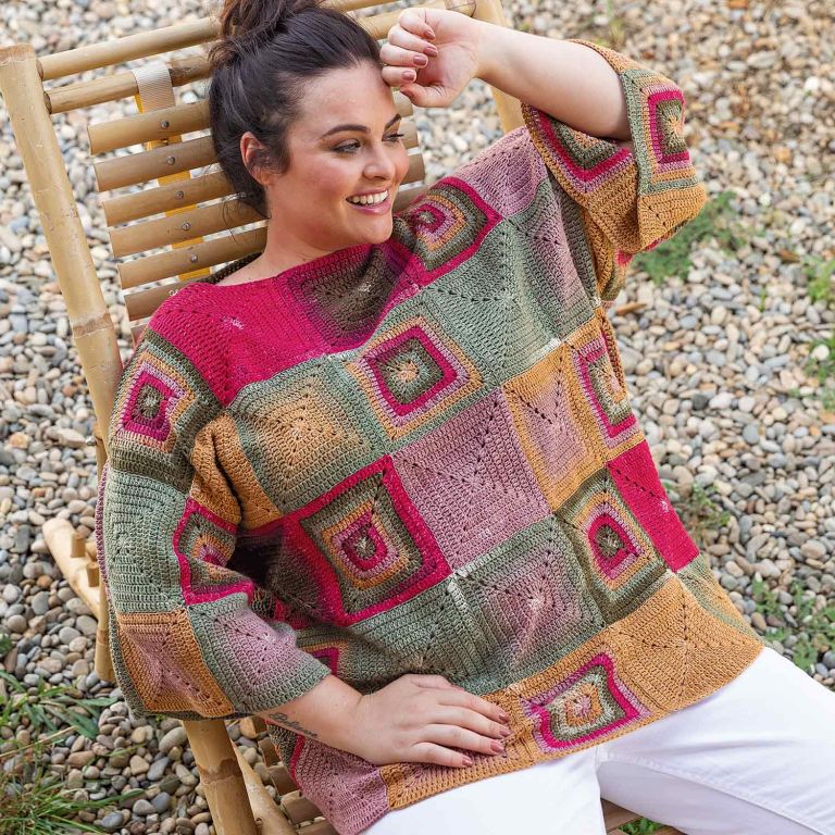 Fair Cotton Granny square blouse plus size pattern Dress elegantly in this modern plus size pattern! This granny square blouse is made using multicolored Fair Cotton Granny yarn. Each ball makes 12 granny squares! Enjoy the perfect design to wear with pants and dresses. Achieve and instantly elegant look by crocheting this oversized granny square sweater!