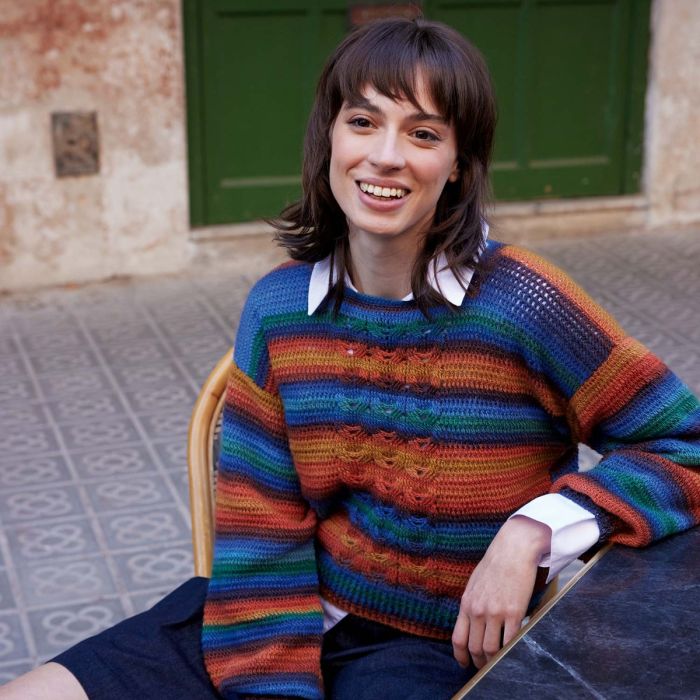 Make a statement with this crochet sweater featuring bold cables, puffed sleeves, and a striped-color effect thanks to Concept Silky Lace Rainbow — a multicolor merino-silk yarn with a soft, elegant gradient. A light, feminine piece perfect for wearing year-round.