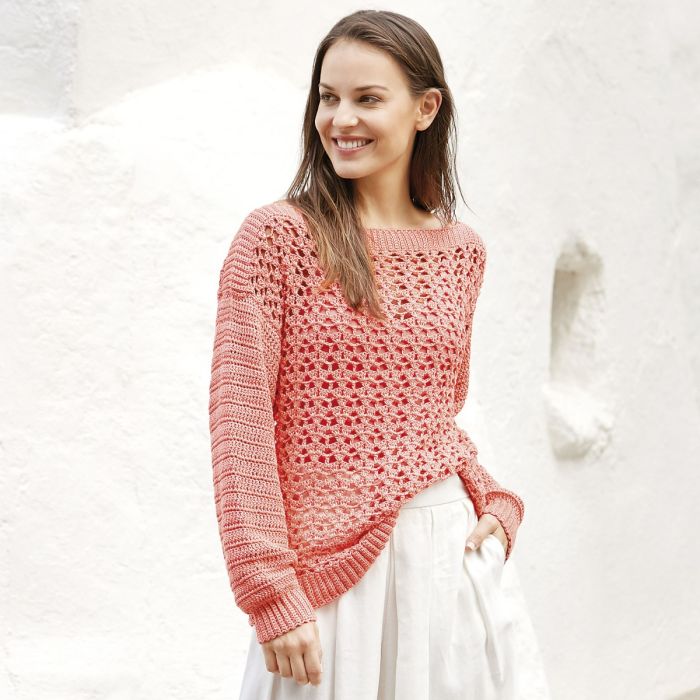 A women's long sleeve crochet sweater with eyelet stitch body using Versailles.