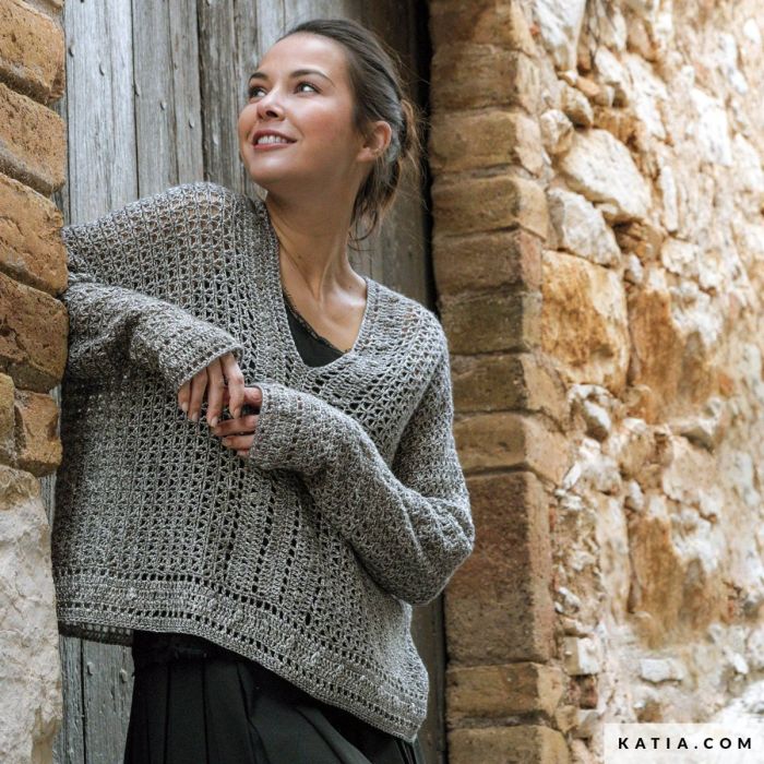 Give a sophisticated flair to your looks with crochet and our fabulous Air Lux yarn. Learn to create a sweater with this crochet pattern: start with one sleeve, work across the body (front and back) and finish with the second sleeve. Enjoy an oversized sweater with a v-neckline and vertical and horizontal lace lines.