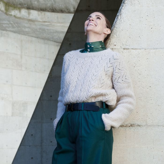 Alpaca Silver arrowhead lace sweater knitting kit A boxy sweater with wide straight sleeves knit with Alpaca Silver. The body is knit with an arrowhead lace motif and the sleeves are knit in 1x1 rib. It has a wide round neck to show off the original collars of your shirts. The kit of the neckline, cuffs, and rib hem give the sweater an elegant touch.