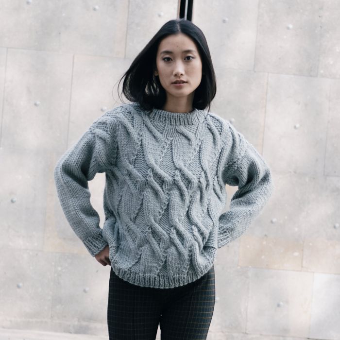 Big Merino cabled women’s sweater kit Are you looking for a comfortable, timeless, and perfect piece for your winter looks? This sweater with large cables, a round neckline, and a straight silhouette knit with Big Merino yarn will become your favorite pattern.
