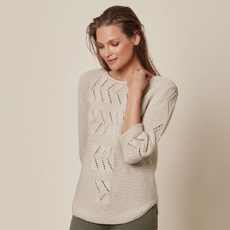 Woman's eyelet motif knit jumper using 3.5mm and 4mm knitting needles. Ideal for Winter, use a mixture of techniques; garter, pattern and purl, to create this intermediate pattern.