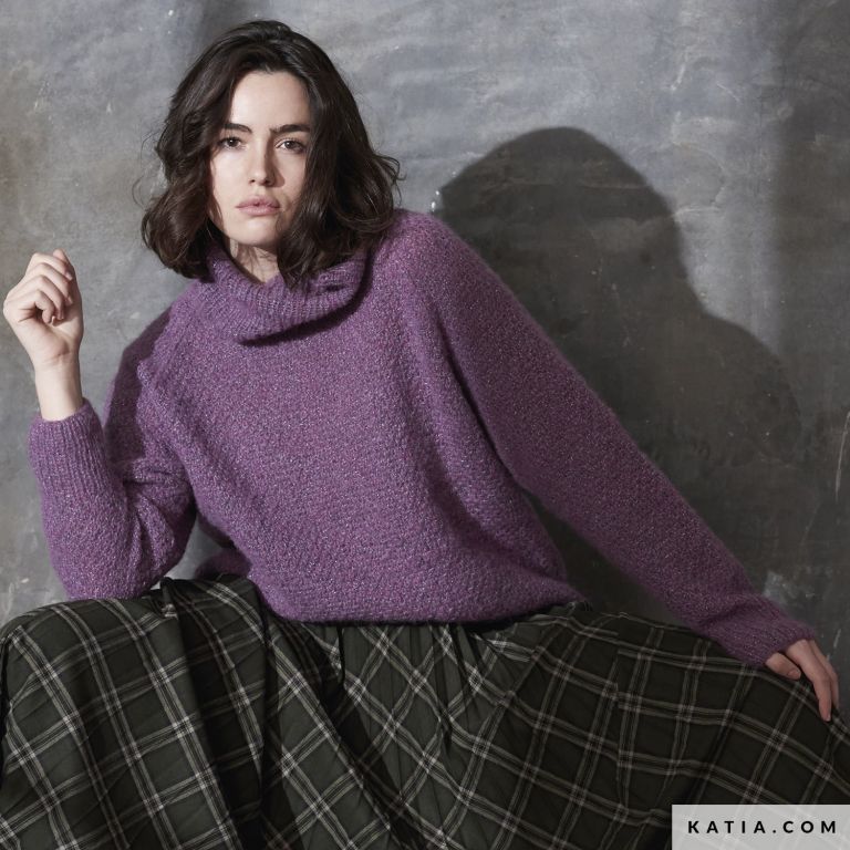 Use Alpaca Silver to knit a purple sweater, one of the colors of the season, with an extra silver sparkle. A light and modern Katia Plus Sizes pattern perfect for wearing with skirts. Enjoying a raglan sleeve sweater with a cowl neck is extremely easy with this Concept by Katia pattern.