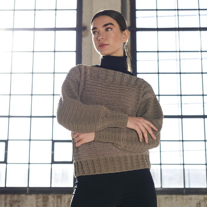 Gatsby & Merino Baby bateau neckline sweater crochet pattern We suggest making a bateau neckline crochet sweater with a shiny effect. Enjoy combining two yarns with different structures: on the one hand, the body made with Gatsby and, on the other, the sleeves and rib with Merino Baby.