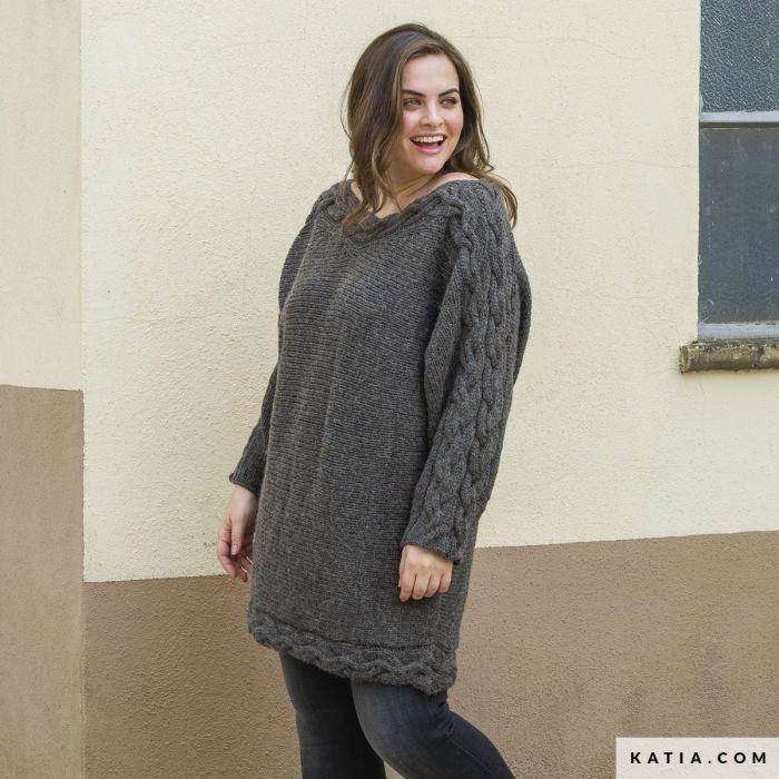 Long knitted sweater or dress with cable pattern on the sleeves, neckline and lower edge available in plus sizes. This pattern is made up of two equal pieces that are knitted sideways, starting at the sleeves.