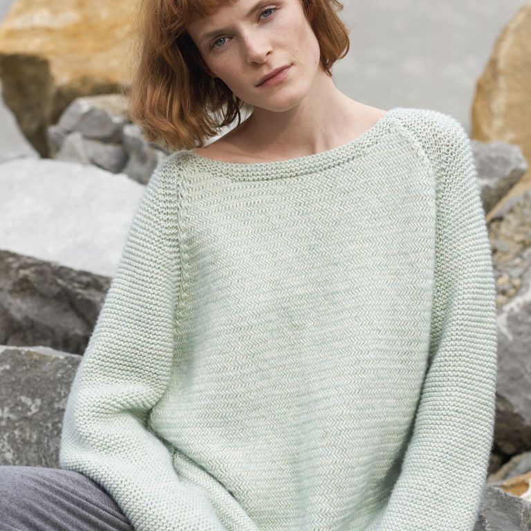 This minimal raglan sleeve jumper in mint green is knitted in herringbone stitch with a round neck band in garter stitch. Learn how to knit herringbone stitch with our video tutorial, click on Herrinbone Stitch in the section Stitches Used.