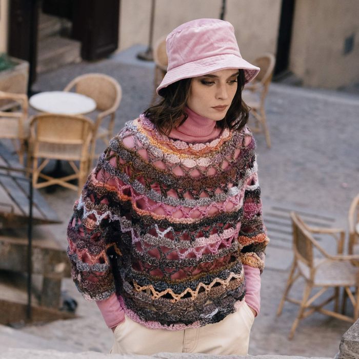 Azteca eyelet poncho crochet sweater Are you looking for a fun and comfortable garment? Try this mini crochet poncho with eyelets made with Azteca yarn. Perfect to wear over a shirt or blouse on a chilly day, this piece is really easy and quick to make.