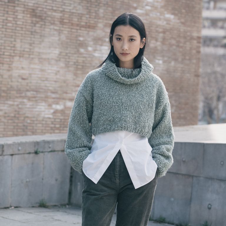 Komorebi high neck cropped women’s sweater pattern Are you looking for a modern and youthful sweater for a layered winter look? This high neck cropped women’s sweater is perfect! Knit with Komorebi, a fleece-effect yarn, this cropped knit pullover features a loose neck and puffed sleeves.