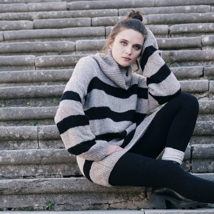Snowy wide stripe long women’s sweater pattern This long women’s sweater with wide stripes is knit with Snowy, a voluminous yarn with a subtle fur effect. The two-toned striped print, high neck, and straight sleeves make it the perfect wardrobe staple.