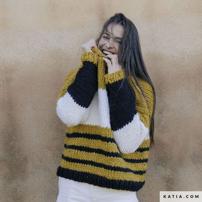 Learn to create a striped stockinette stitch jumper using a combination of 3 colours of your choice. Feel the warmth and softness of Love Wool and a pair of XL knitting needles.