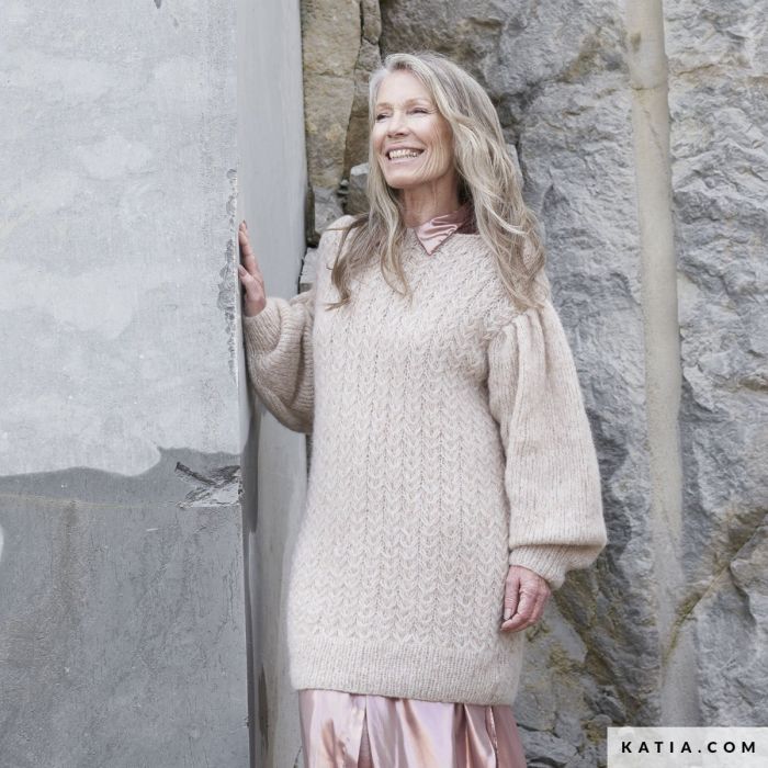 Create a beautiful cable stitch herringbone design with this intermediate-easy level pattern and look amazing in this fabulous long jumper with puffed sleeves. You can also wear it as a dress this Winter.