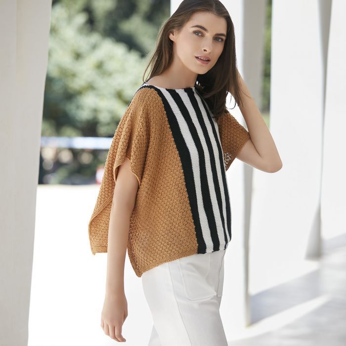 Using a combination of stitches; garter, pattern and stripe, create this women's summer jumper featuring a statement panel front using Cotton Alpaca. Cotton Alpaca is a soft comfortable cotton and this garment can be knitting in a range of colours available.
