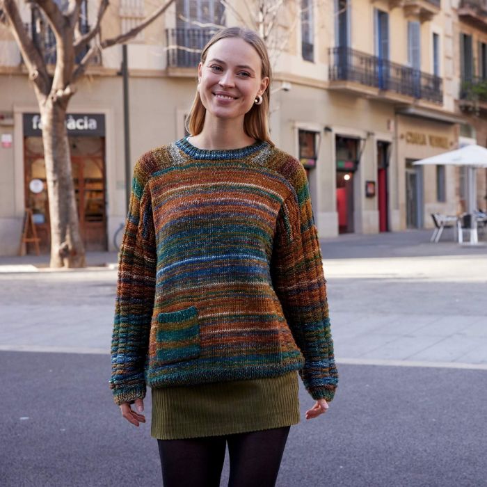 This textured block sweater is knit with Concept Cotton-Merino Paradiso, a multicolor yarn blending extrafine merino and cotton that creates stripes effortlessly. A modern and comfortable design with a wide fit, long cuffs, and a ribbed neckline. A fun, colorful basic with a playful pocket you can start knitting now in PDF format.