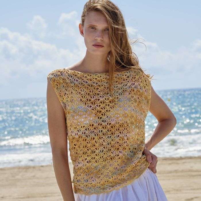 Bohemian Silk free women's top pattern Add a touch of freshness and fun to summer with this crochet top! Follow this free pattern using Bohemian Silk yarn, which as well as being in a vibrant color, adds softness and lightness. This design features straight lines, a bateau neckline, and an interesting fantasy lace pattern to achieve a trendy look. Its see-through effect is perfect to wear with your favorite bikinis on days at the beach or at music festivals.