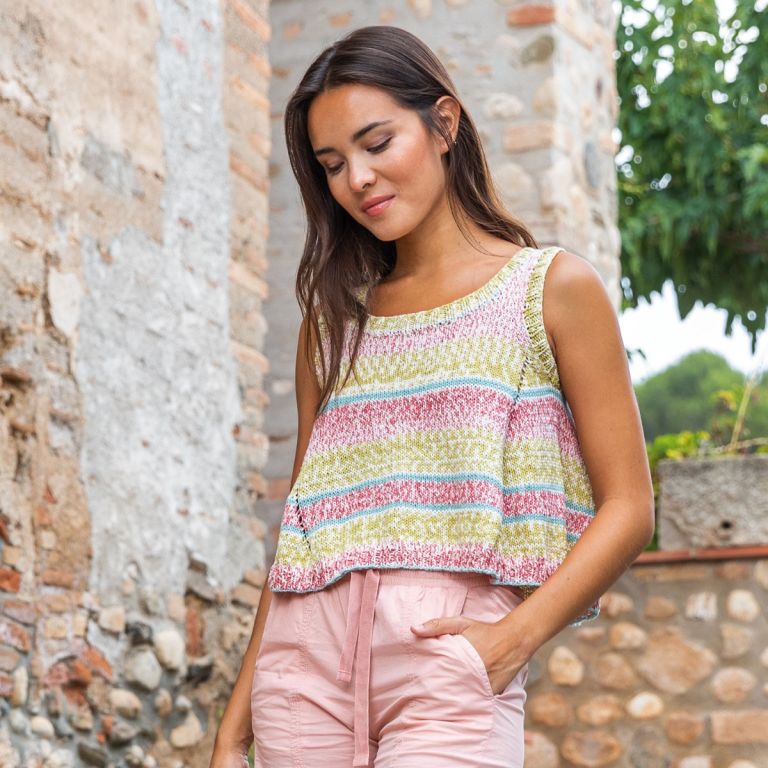 Work with the circular technique this oversized crop top with straps in a refreshing and summery jacquard effect. The side increases decorate the garment. Prepare your summer garments in Mediterranea, a cotton with a fun Jacquard print.