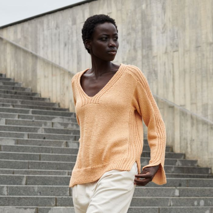 This V-neck sweater pattern, knit with Calma yarn by Concept by Katia, stands out for its unique sleeve structure and ribbed details throughout the body. With decorative slits on the sides and sleeves, this warm and comfortable garment is perfect for everyday wear. Pair it with midi dresses or casual looks. Get started today and knit this design from the All Seasons 6 magazine!
