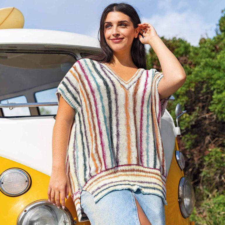 Paraiso V-neckline blouse plus size knitting pattern Look amazing in this long sweater knit with Paraiso yarn! With its plunging V-neckline and colorful design, this sweater perfectly hugs your figure to give you a modern and elegant look. It's horizontal stripes with side slits allow you to show off your figure, while the flat nits rib allows you to where it with long and fitted garments.