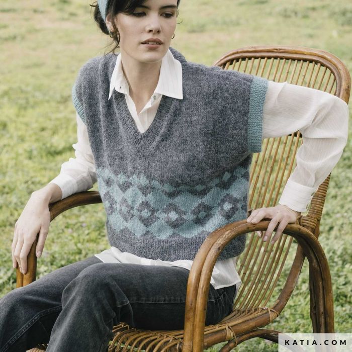 Knitted vests are the new wardrobe staple for fashion lovers. This pattern knit with Soft Gratté is for a straight-line, oversized, cropped vest; with a flattering v-neckline, ideal to show off shirt collars; and a colorwork geometric motif, a modern classic. Knit the matching headband for the full outfit.