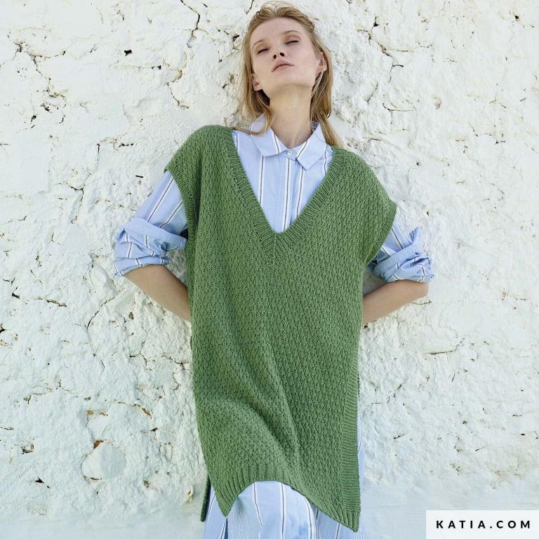 Enjoy wearing modern oversized garments with this knitting pattern from the All Seasons magazine. We suggest knitting a straight, long, V-neck vest with long side slits. A design knit in emerald green, a trendy color that connects with nature. Turn some balls of Ultrasoft into this oversized vest and enjoy its textured diamond pattern.