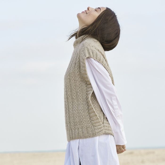 Knitted slipover vest with a textured vertical stripe stitch design, round neckline and false cap sleeves and side splits. Knitted using Concept Cotton Merino.